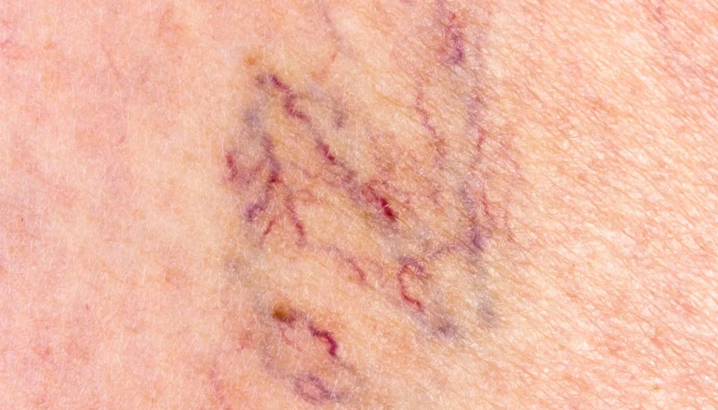 Spider veins are smaller, web-like veins that typically appear on the legs and face. They are usually red, blue, or purple and lie close to the skin’s surface. Unlike varicose veins, they do not bulge but can spread in clusters or branch out in thin lines.